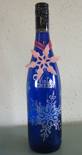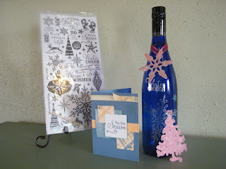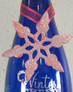 I absolutely love the glitter rub ons we have. Here’s a little insider info (there are more coming in the new Spring book!) YAY! Here a project was born at 2:30 am when my roomie, Trudy and I were at a scrapbook retreat and were showing Glitter Rub Ons as a demo. We remembered a blue wine bottle sitting on the table. So, a covert operation was put into action and a super fab decoration for Christmas was born!