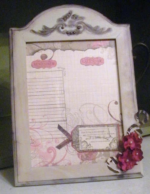 I found an old frame that I got at Ikea a long time ago. I gave it a new life by distressing it with black Staz On ink and I added some opaques. I used Roxy Level 2 for the background paper.I also stamped on Cricut die cut images with the Limited Edition Stamp Set. Sized at 3/4″ they were perfect for stamping the titles, “remember” and calendar.