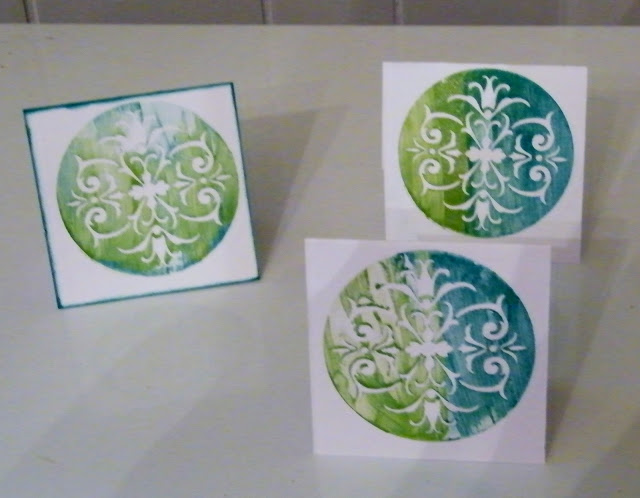 I wanted the image to be front and center. I decided to make some simple 3×3 cards that I can use when I send out a quick note with a catalog or drop in a co-worker’s mailbox. I am ready for spring so I chose this color palette. To get this look I swiped the ink pad across the large circle stamp with Lagoon and Pear. It gives it almost a watercolor look, with some marbling.